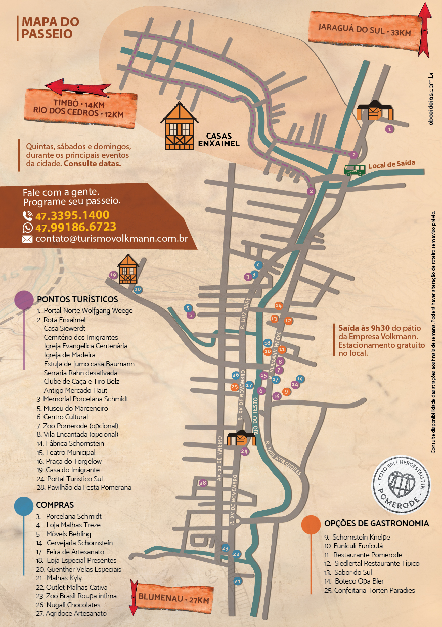 (1) Portal Norte Wolfgang Weege; (2) Rota Enxaimel: Casa Siewerdt, Cemitério dos Imigrantes, Igreja Evangélica Centenária, Capela de madeira, Estufa de fumo Casa Baumann, Serraria Rahn desativada, Clube de Caça e Tiro Belz, Antigo Mercado Haut. (3) Memorial Porcelana Scmidt; (4) Casa do Marceneiro; (5) Centro Cultural; (6) Zoo Pomerode (opcional); (7) Vila Encantada (opcional); (8) Fábrica Schonstein; (9) Teatro Municipal; (10) Praça do Torgelow; (11) Casa do Imigrante; (12) Portal Turístico Sul; (13) Pavilhão de Eventos da Festa Pomerana.