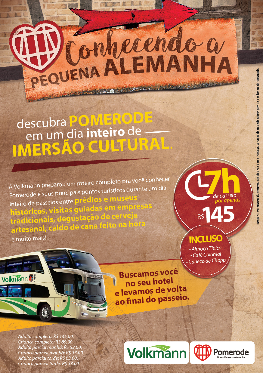 O projeto "Conhecendo a pequena Alemanha" levará você para uma imersão cultural durante um dia inteiro. Conheça prédios e museus históricos, gastronomia, visitas guiadas em empresas tradicionais, degustação de cerveja artesanal, caldo de cana feito na hora e muito mais. O roteiro completo tem duração de 7 horas, incluindo almoço (exceto bebidas), café colonial e um caneco de chopp por apenas R$145,00 por pessoa.